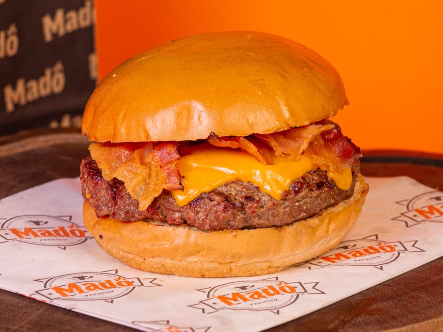 Nosso Burger agridoce. Pão australiano chapeado, bacon, escolha seu burger, duplo cheddar, cebola caramelizada Madô e maionese da casa.