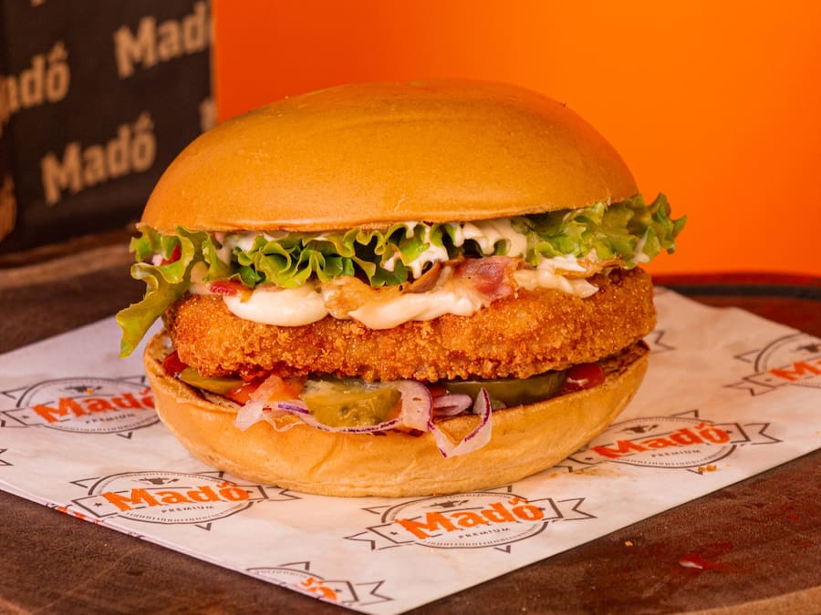 Nosso Burger de frango. Pão brioche tostado, burger de frango 110g empanado, molho especial, cebola roxa, picles, Catupiry, alface, tomate bacon e maionese.
