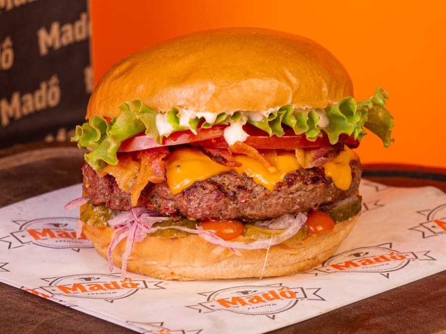 Nosso Burger agridoce. Pão australiano chapeado, bacon, escolha seu burger, duplo cheddar, cebola caramelizada Madô e maionese da casa.